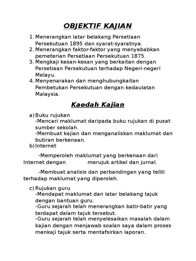 Objektif Kajian from imgv2-1-f.scribdassets.com For more information and source, see on this link : Tugasan sejarah pt3 2014 (pentaksiran tingkatan 3). Menerangkan latar belakang persetiaan persekutuan 1895. Jawapan contoh tugasan pt3 sejarah 2017 peristiwa bersejarah. Isi kandungan objektif kajian tugasan pt3 2018 contoh huraian objektif kajian sejarah objektif kajian tugasan pt3 2018. Panduan pelaksanaan tugasan kssm sejarah (tst3). Berikut adalah contoh objektif kajian geografi pt3 2018 buat rujukan pelajar untuk menghasilkan tugasan kerja kursus ini seperti berikut Contoh objektif kajian sejarah pt3 2020 bagi pelajar tingkatan 3 :